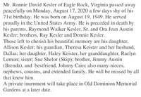 Kesler, Ronnie David, 1949 - 2020 Ronnie David Kesler, of Eagle Rock, was born on August 19, 1949 to Raymond Walker Kesler, Sr. and Ora Jean Austin Kelser. He had one daughter, Allison Kesler. Ronnie Kesler died on August 17, 2020, and is buried in Old Dominion Memorial Gardens.