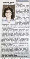 Baker, Tammy Eaton, 1962 - 2021 Tammy Eaton Baker was born on August 3, 1962 in Pearisburg to John Eaton and Carolyn Wilburn. Her stepfather was Ted Wilburn. She married Kevin Baker. They had two children, Christine Rollins and Erica Schurdell. Tammy Baker died on April 24, 2021, and is buried in Old Dominion Memorial Gardens. She lived in Troutville.
