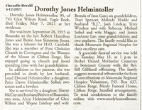 Helmintoller, Dorothy Jones, 1925 - 2021 Dorothy Jones Helmintoller was born on September 28, 1925 in Roanoke to Robert Hamilton Jones and Bettie Ann Simmons Jones. She married Loyd Elwood Helmintoller. They had four children: Patty Dawn Helmintoller Seibel, Sherry McCoy, Alvin Helmintoller, and Wayne Lindsay. Dorothy Helmintoller died on May 7, 2021. She lived in Eagle Rock.