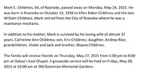 Childress, Mark Edward, 1956 - 2021 Mark E. Childress was born on October 13, 1956 in Roanoke to Ellen Baker Childress and William Childress. He married Catherine Ann Childress. They had two children, Eric Childress and Andrea Rice. Mark Childress died on May 24, 2021, and is buried in Old Dominion Memorial Gardens. He lived in Roanoke.