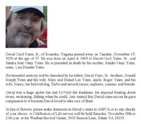 Yates, David Cecil, Jr., 1963 - 2020 David Cecil Yates, Jr., of Roanoke, was born on April 4, 1963 to David Yates Sr. and Sandra Yates. He died on November 17, 2020.