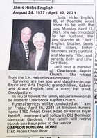 English, Janis Hicks, 1937 - 2021 Janis Hicks English was born on August 24, 1937 to Kelly and Lillie Carr Hicks. She married Rev. Olander M. "Red" English. She had a son, Bruce English. Janis English died on April 12, 2021, and is buried in Old Dominion Memorial Gardens. She lived in Roanoke.
