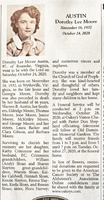 Austin, Dorothy Lee Moore, 1932 - 2020 Dorothy Lee Moore Austin was born on November 16, 1932 in Wytheville to Jessie and George Moore. She married Warren B. Austin. They had one child, Kathy Crimmins. Dorothy Austin died on October 24, 2020, and is buried in Old Dominion Memorial Gardens. She lived in Roanoke.