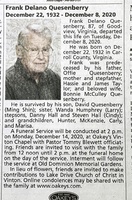 Quesenberry, Frank Delano, 1932 - 2020 Frank Delano Quesenberry was born on December 22, 1932 in Carroll County to Offie Quesenberry and Hassie Taylor. His stepfather was James Taylor. He married Bonnie McCulley Quesenberry. They had one child, David Quesenberry, and two stepchildren, Danny and Steven. Frank Quesenberry died on December 8, 2020, and is buried in Old Dominion Memorial Gardens. He lived in Goodview.