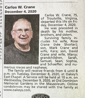 Crane, Carlos W, 1945 - 2020 Carlos W. Crane, of Troutville, was born in 1955. He married Rose Crane. They had two children, Mark and David. Carlos Crane died on December 4, 2020, and is buried in Old Dominion Memorial Gardens.