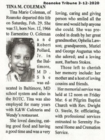 Coleman, Tina Marie, 1966 - 2020 Tina Marie Coleman was born on November 12, 1966 in Baltimore, Maryland to Earnestine O. Coleman and Robert Pollard, Jr. She died on February 29, 2020, and is buried in Old Dominion Memorial Gardens.