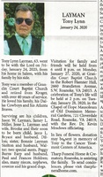 Layman, Tony Lynn, 1957 - 2020 Tony Lynn Layman was born in 1957. He had three children, Jason W. Layman, Jamey L. Miller, and Jesse L. Layman. Tony Layman died on January 24, 2020, and is buried in Old Dominion Memorial Gardens. He lived in Salem.