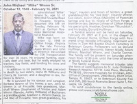 Wrenn, John Michael, 1948 - 2021 John Michael "Mike" Wrenn, Sr was born October 12, 1948 to Florence Ayers Wrenn and John H. Wrenn, Jr. He married Barbara Ann Woodson Wrenn, and had a son, John M. Wrenn, Jr. He died February 16, 2021, and is buried in Zion Hill Baptist Church Cemetery.