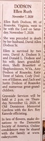 Dodson, Ellen Ruth, 1931 - 2020 Ellen Ruth Dodson, of Roanoke, was born in 1931. She married David Allen Dodson Sr. They had two children, David A. Dodson, Jr. and Donald L. Dodson. Ellen Dodson died on November 7, 2020, and is buried in Old Dominion Memorial Gardens. She lived in Roanoke.