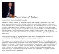 Basham, Wayne L, 1934 - 2020 Wayne Lee "Johnny" Basham, of Moneta, was born on June 18, 1935 to Oglesby and Madeline Basham. He married Melva Gillaspie Basham. They had one child, Donna Jacobs. Wayne Basham died on December 26, 2020, and is buried in Old Dominion Memorial Gardens.