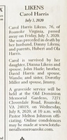 Likens, Carol H, 1944 - 2020 Carol Harris Likens, of Roanoke, was born to Hubert and Ola Harris. She married Danny Likens. They had one child, Dianna. Carol Likens died on July 3, 2020, and is buried in Old Dominion Memorial Gardens. She lived in Roanoke.