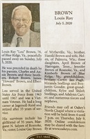 Brown, Louis Ray, 1943 - 2020 Louis Ray "Lou" Brown, of Blue Ridge, was born to Charles and Annie Brown. He was in a relationship with Margaret N. Salyers. He has three children, April Brown, Jennifer Brown, and Kimberly Brown. Louis Brown died on July 5, 2020.