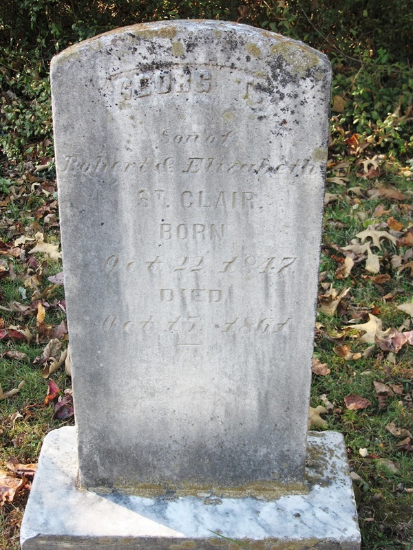 - George Thomas St. Clair was born October 22, 1847 to Robert Mitchell St. Clair and Sarah Elizabeth Kelley St. Clair. He died October 15, 1861, aged 13 years, and was buried at St. Clair Cemetery.