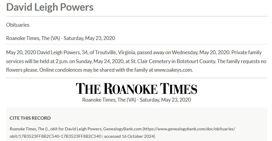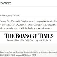 - David Leigh Powers was born August 15, 1985 to James Daniel and Melinda Powers. He died May 20, 2020, and is buried at Saint Clair Cemetery. He lived in Troutville.