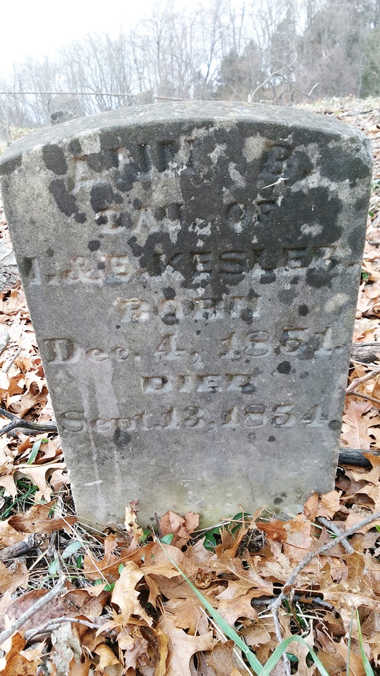 - Ann B. Kesler was born in 1851 to I. & E. Kesler. She died in 1854 at the age of 2 years, 9 months, and 9 days, and is buried in Brick Union Cemetery.