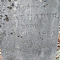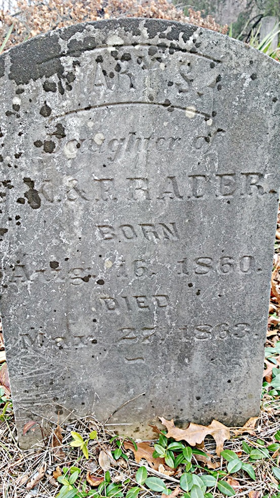 - Mary S. Rader was born August 16, 1860 to John K. Rader and Frances Old Rader. She died Mary 27, 1863, aged 2 years old, and is buried at Brick Union Cemetery.