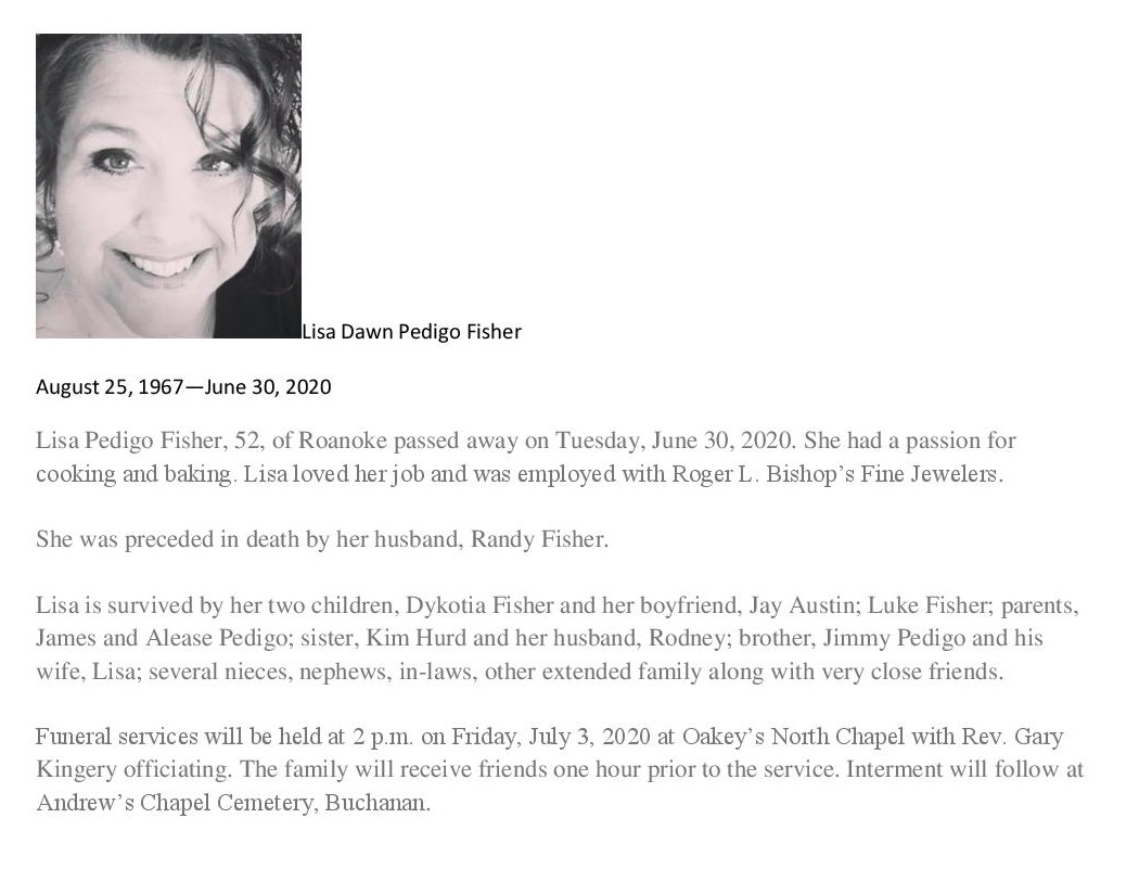 - Lisa Dawn Pedigo Fisher was born August 25, 1967 to James and Alease Pedigo. She married Randy Fisher, and her children include Dykotia Fisher and Luke Fisher. Lisa Fisher died June 30, 2020, and is buried at Andrew's Chapel Cemetery. She lived in Roanoke.