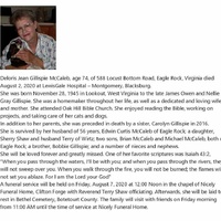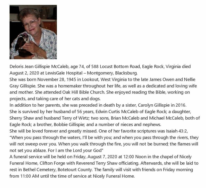 - Deloris Jean Gillispie McCaleb was born November 28, 1945 in Lookout, West Virginia to James Owen and Nellie Gray Gillispie. She married Edwin Curtis McCaleb. Her children include Sherry Shaw, Brian McCaleb, and Michael McCaleb. Deloris McCaleb died August 2, 2020, and is buried in Bethel Cemetery. She lived in Eagle Rock.