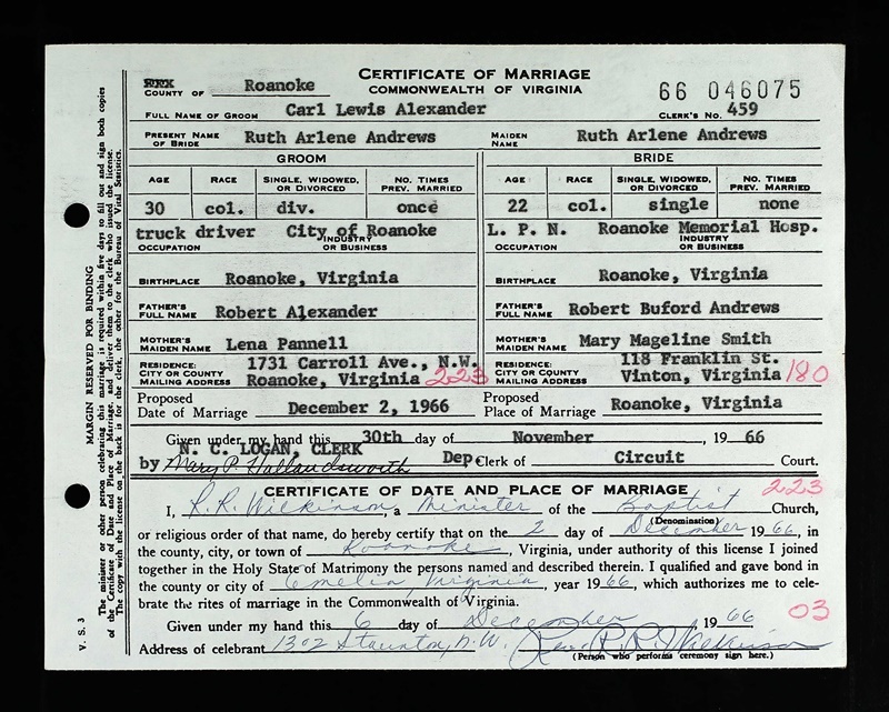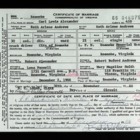 - Image 7 - Certificate of Marriage between Carl Lewis Alexander and Ruth Arlene Andrews dated December 6, 1966