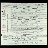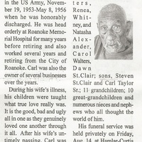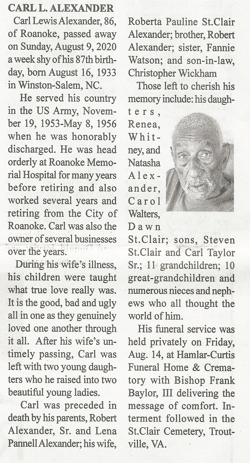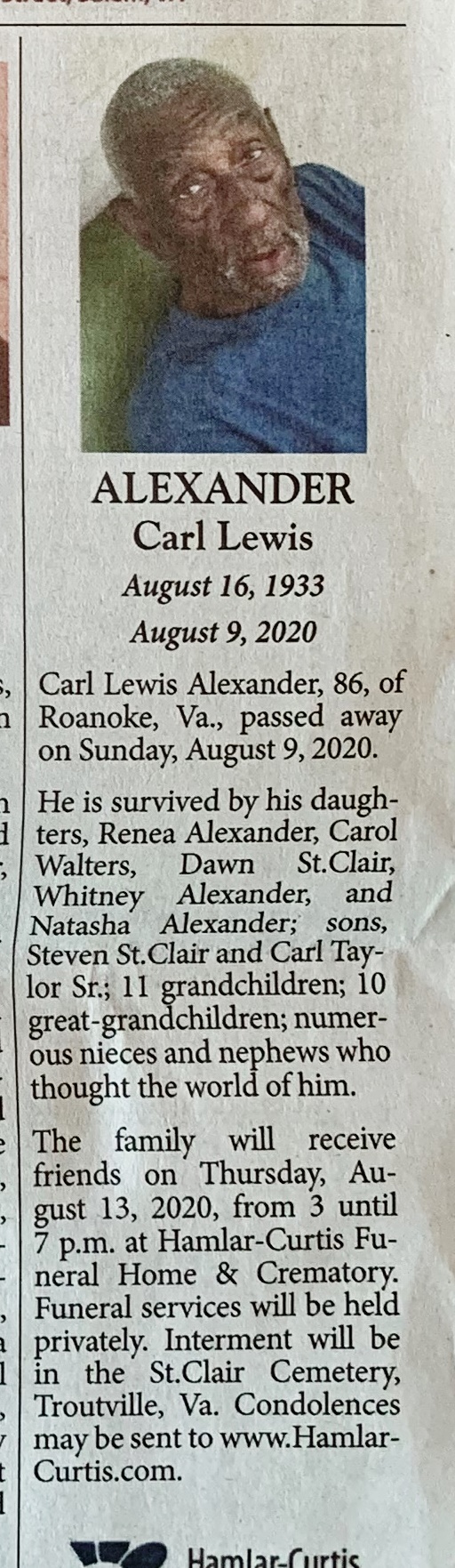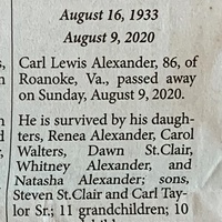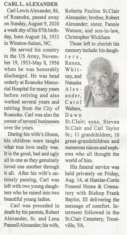 - Carl Lewis Alexander was born August 16, 1933 to Robert Alexander, Sr. and Lena Pannell Alexander. He married Pearl Anita Hendricks in 1954, and they divorced in 1956. He married Frances Marie Muse in 1957, and they divorced 1966. He married Ruth Arlene Andrews in 1966, and they divorced in 1971. He married Roberta Pauline St. Clair in 1983. His children include Renea Alexander, Carol Walters, Dawn St. Clair, Whitney Alexander, Natasha Alexander, Steven St. Clair, and Carl Taylor, Sr. Carl Alexander died August 9, 2020, and is buried in the St. Clair Cemetery. He lied in Roanoke.