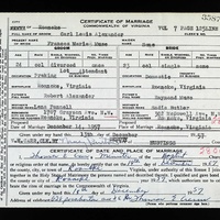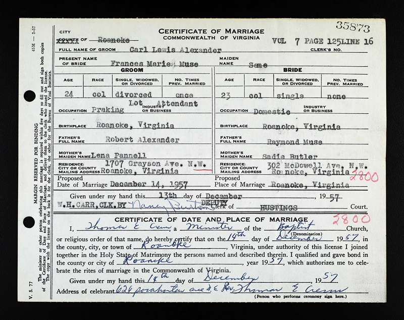 - Image 5 - Certificate of Marriage between Carl Lewis Alexander and Frances Marie Muse, dated December 14, 1957.