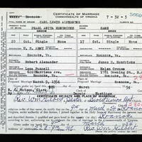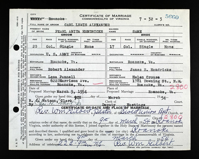 - Image 3 - Certificate of Marriage between Carl Lewis Alexander and Pearl Anita Hendricks, dated March 9, 1954.