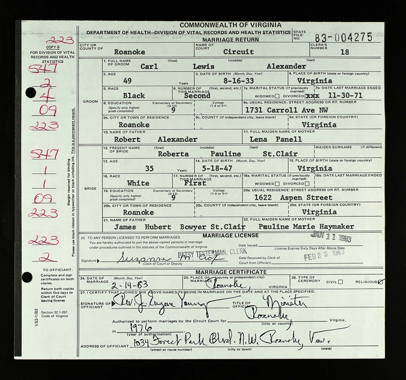 - Image 9 - Marriage Return between Carl Lewis Alexander and Roberta Pauline St. Clair, dated February 14, 1983.