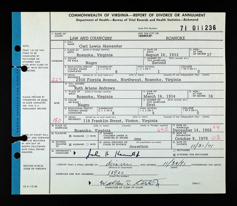 - Image 8 - Report of Divorce of Annulment between Carl Lewis Alexander and Ruth Arlene Andrews, dated November 30, 1971.
