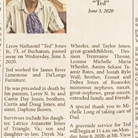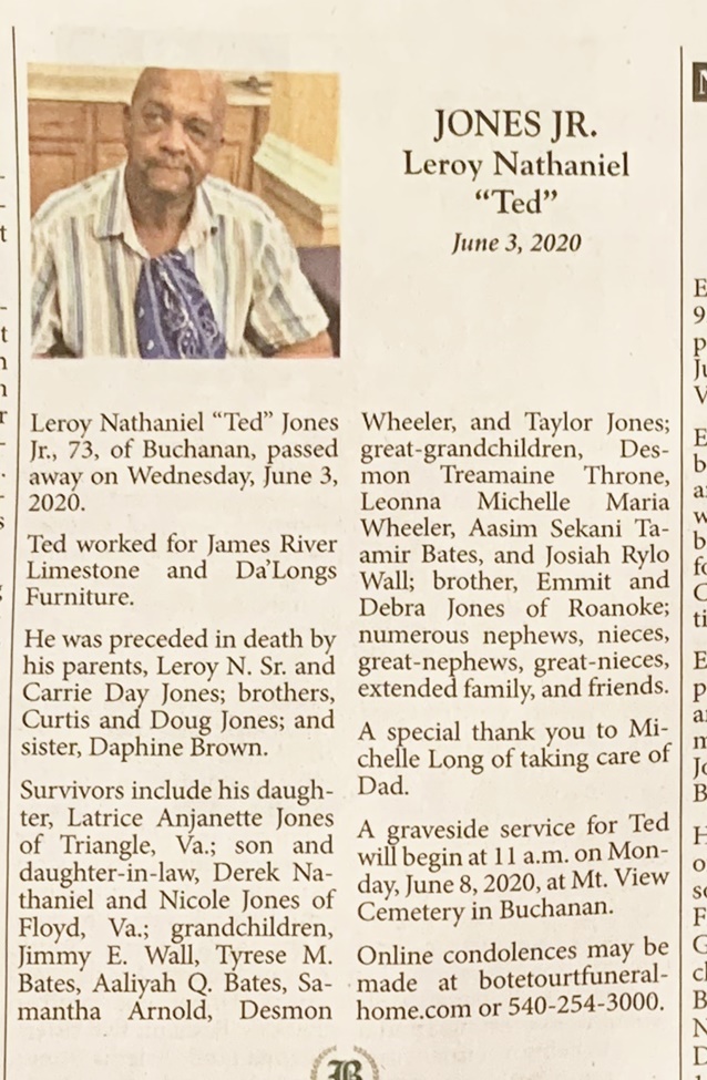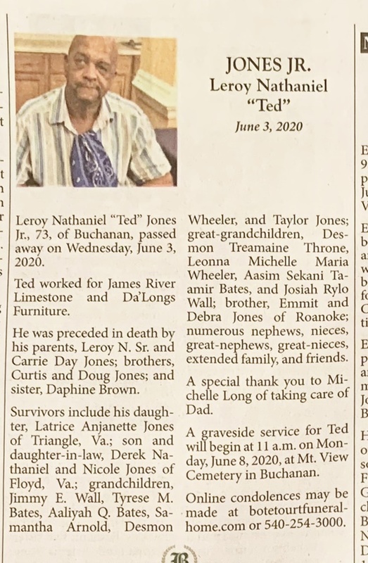 - Leroy Nathaniel "Ted" Jones, Jr. was born February 28, 1947 to Leroy Nathaniel Jones, Sr. and Carry Day Jones. His children include Latrice Anjanette Jones and Derek Nathaniel Jones. Leroy Jones, Jr. died June 3, 2020, and is buried at Mt. View Cemetery. He lived in Buchanan.