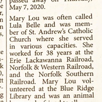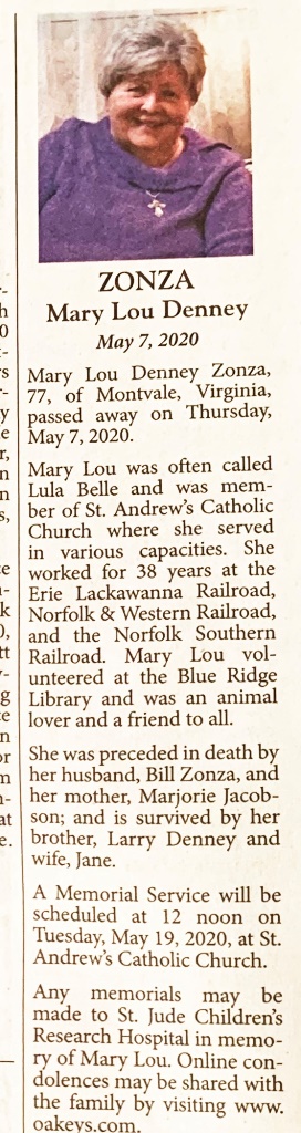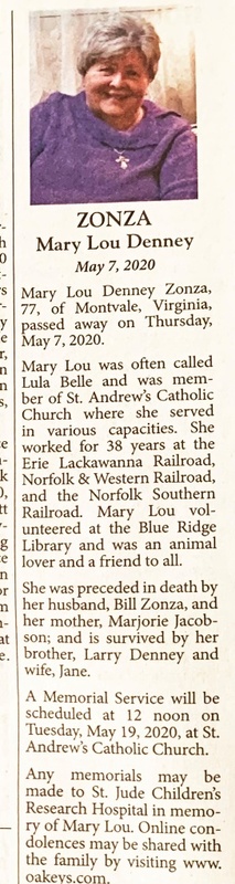 - Mary Lou (Lula Belle) Denney Zonsa was born May 27, 1942 to Marjorie Jacobson. She married Bill Zonza. She volunteered at the Blue Ridge Library. Mary Lou Zonza died May 7, 2020, and her burial details are unknown.