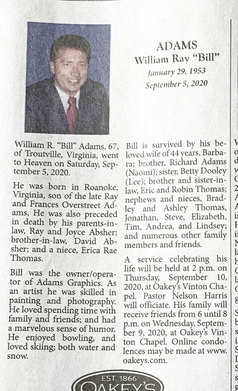 - William Ray "Bill" Adams was born January 29, 1953 to Ray and Frances Overstreet Adams. He married Barbara Adams. William Adams died September 5, 2020, and is buried in Mountain View Cemetery. He lived in Troutville.