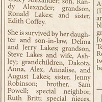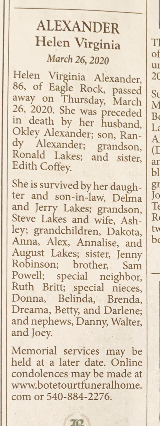 - Helen Virginia Alexander was born June 23, 1933. She married Oakey Alexander, and her children included Randy Alexander and Delma Lakes. She died March 26, 2020. Her burial details are unknown. She lived in Eagle Rock.