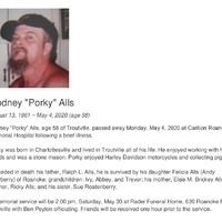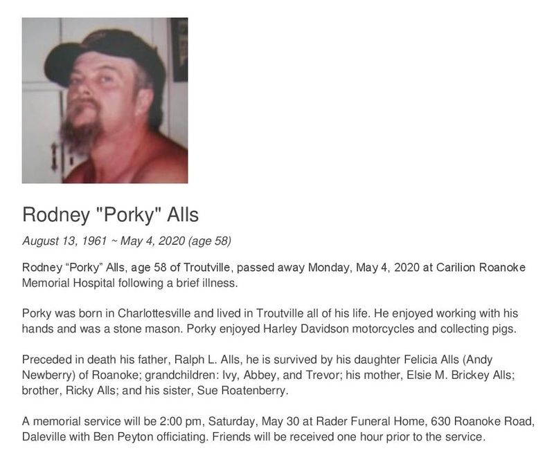 - Rodney "Porky" Alls was born August 13, 1961 to Ralph L. Alls and Elsie M. Brickey Alls. He had a daughter, Felicia Alls. Rodney Alls died May 4, 2020. His burial details are unknown. He lived in Troutville.
