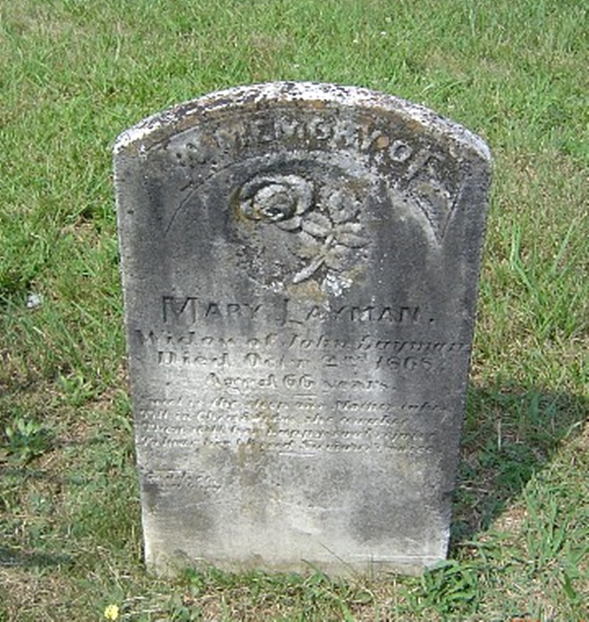 - Mary Layman was married to John Layman. She died October 2, 1868, and is buried in Laymantown Cemetery.