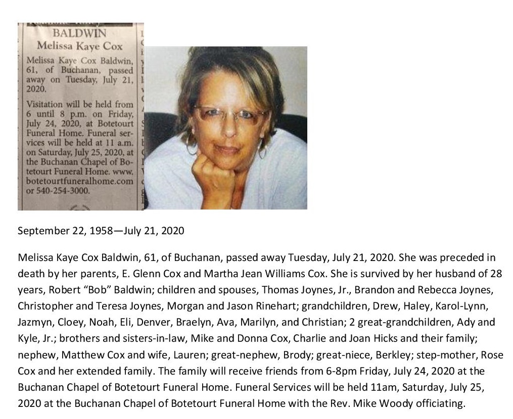 - Melissa Kaye Cox Baldwin was born September 22, 1958 to E. Glenn Cox and Martha Jean Williams Cox. She married Robert "Bob" Baldwin, and her children include Thomas Joynes, Jr., Brandon Joynes, Christopher Joynes, and Morgan Rinehart. Melissa Baldwin died July 21, 2020 and was cremated.