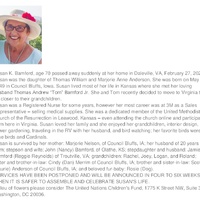 - Susan Bamford was born May 5, 1949 to Thomas William and Marjorie Ann Anderson. She married Thomas Andrew "Tom" Bamford, Jr. She had two stepchildren, John Bamford and Jamie Bamford. She died February 27, 2020, and her burial details are unknown.