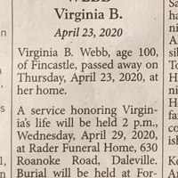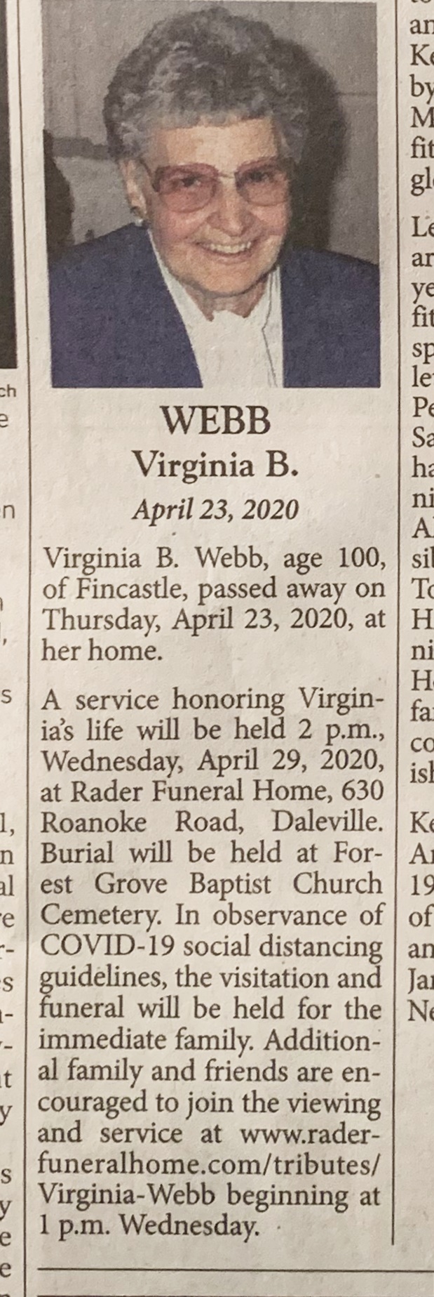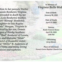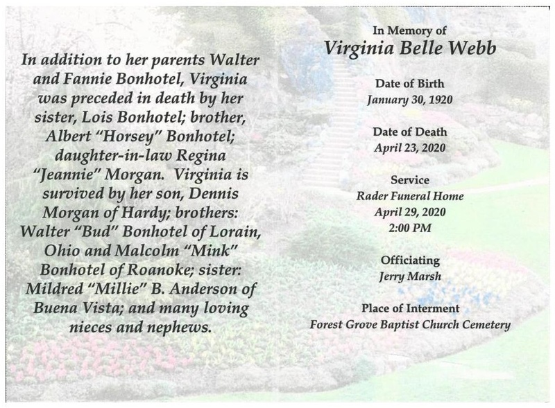- Virginia Belle Webb was born January 30, 1920 to Walter Oscar and Fannie Belle Love Bonhotel. She married John Newton Morgan, Jr. in 1951 and Douglas Eugene Webb in 1963. She had a son, Dennis Morgan. She died April 23, 2020, and is buried at Forest Grove Baptist Church Cemetery. She lived in Fincastle.