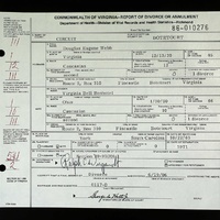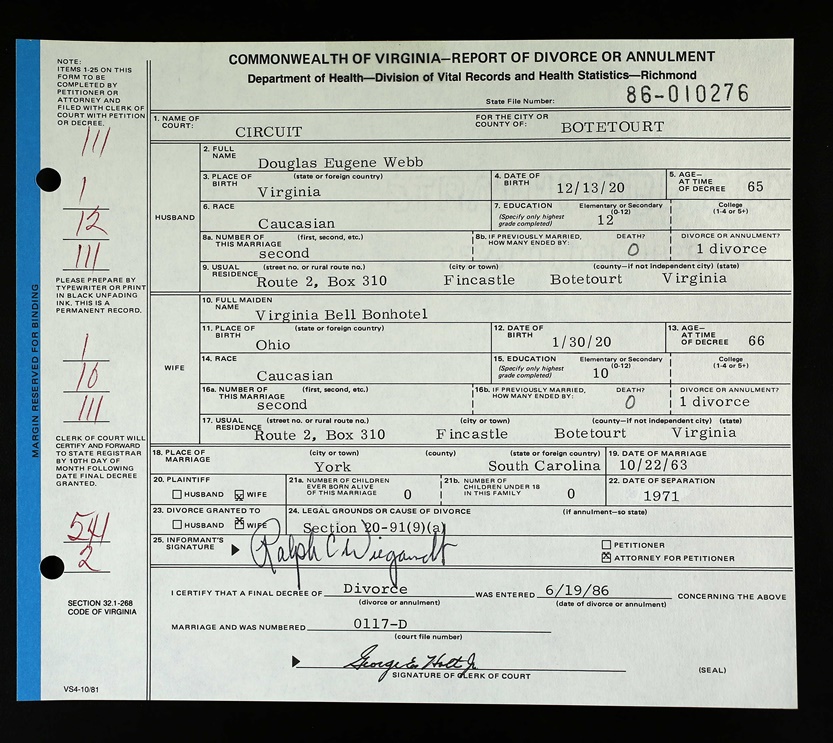 - Image 4 - Report of Divorce or Annulment between Douglas Eugnee Webb and Virginia Bell Bonhotel, indicating a date of marriage of October 22, 1963, and divorce June 19, 1986.