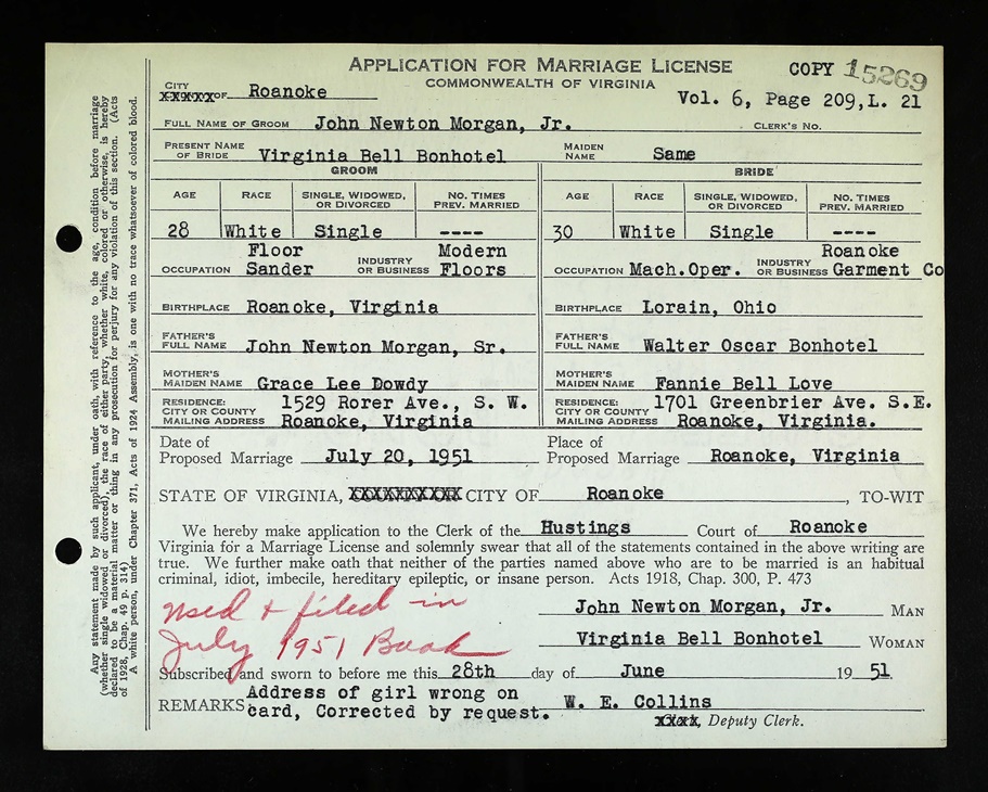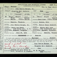 - Image 3 - Application for Marriage License between John Newton Morgan, Jr. and Virginia Bell Bonhotel, dated June 28, 1951.