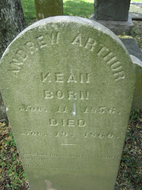 - Andrew Arthur Kean was born November 11, 1856 to Dr. Otho Williams Kean and Jane Smith Arthur Kean. He died November 19, 1860, aged 4, and is buried at Buchanan Episcopal Cemetery.