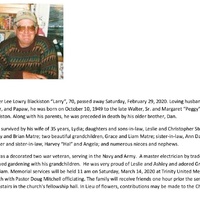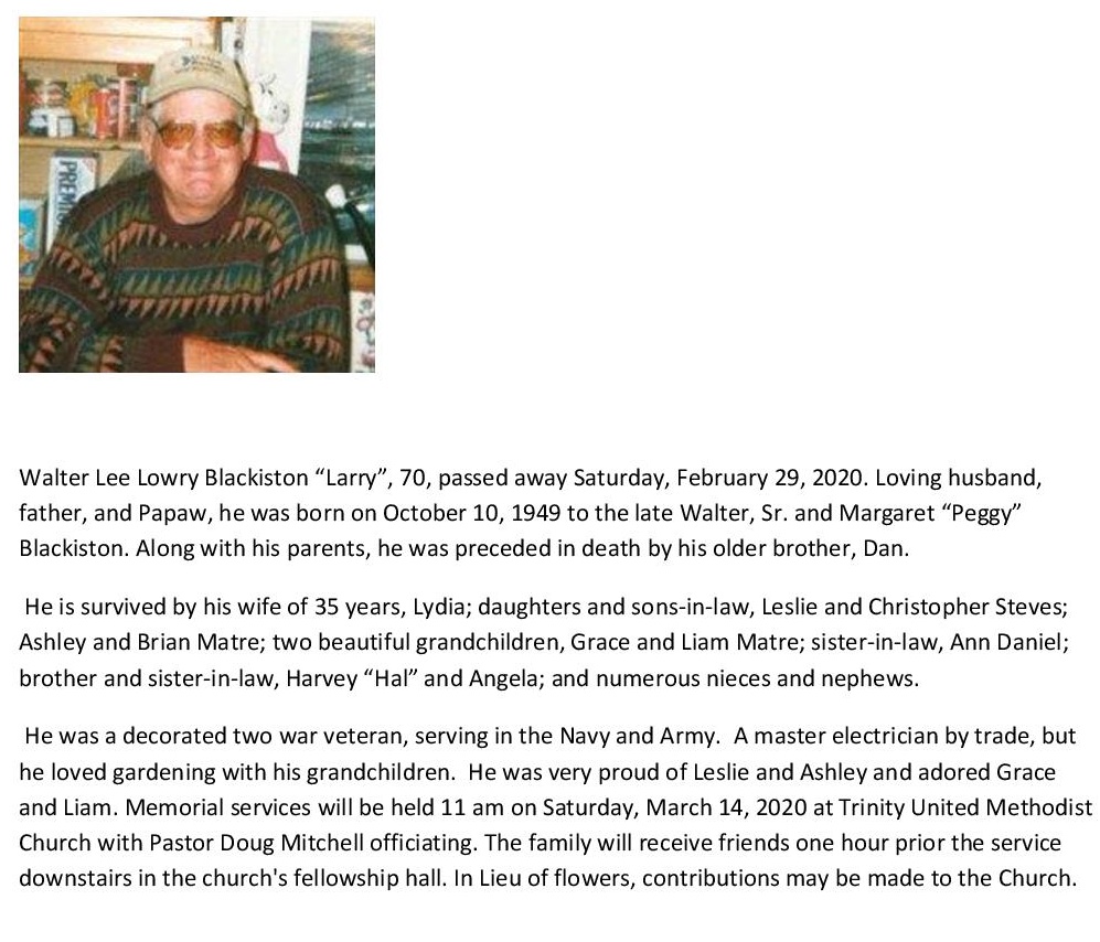 - Walter "Larry" Lee Lowry Blackiston was born October 10, 1949 to Walter Blackiston, Sr. and Margaret "Peggy" Blackiston. He married Lydia Blackson, and had two daughters, Leslie Stevens and Ashley Martre. He died February 29, 2020.