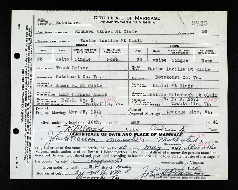 - Image 4 - Certificate of Marriage between Richard Albert St. Clair and Eunice Lucille St. Clair, dated May 30, 1941.