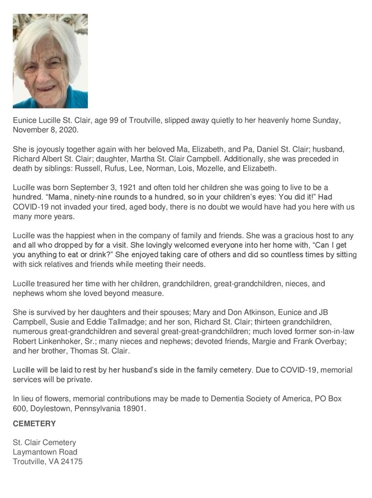 - Eunice Lucille "Lucille" St. Clair was born September 3, 1921 to Daniel "Gillie" St. Clair and Elizabeth Susan Lee "Bettie" St. Clair. She married Richard Albert St. Clair. Her children included Martha St. Clair Campbell, Mary Atkinson, Eunice Campbell, Susie Tallmadge, and Richard St. Clair. She died November 8, 2020, and is buried in Saint Clair Cemetery.