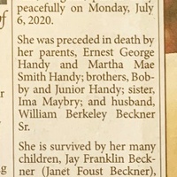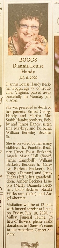 - Diannia Louise Handy Boggs was born July 5, 1943 to Ernest George Handy and Martha Mae Smith Handy. She married William Berkeley Beckner, Sr. Her children include Jay Franklin Beckner, Angela Marie Hall, William Berkeley Beckner, Jr., B. J. Boggs, and Jenny Hicks. She died July 6, 2020. She lived in Troutville.