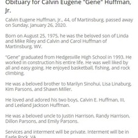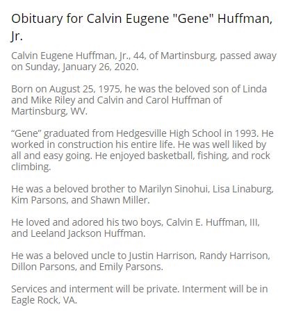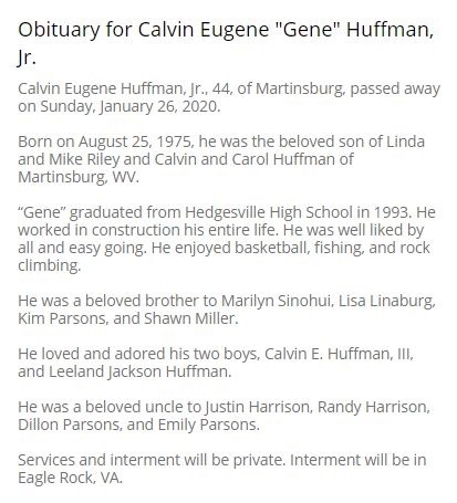 - Calvin Eugene Huffman, Jr. was born August 25, 1975 to Calvin Huffman and Linda Riley. He had two sons, Calvin E. Huffman, III, and Leeland Jackson Huffman. He died January 26, 2020, and was buried in Eagle Rock.