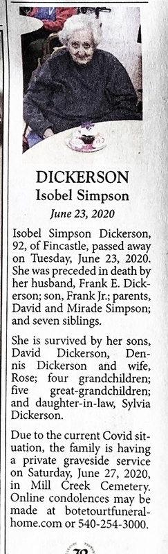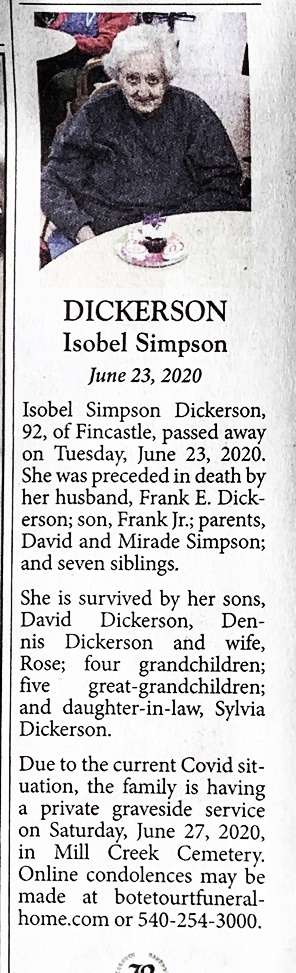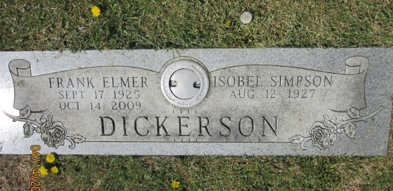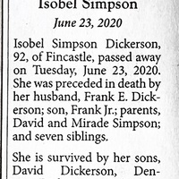 - Isobel Simpson Dickerson was born August 12, 1927 to David Simpson and Mirade Simpson. She married Frank E. Dickerson, and had two sons, David Dickerson and Dennis Dickerson. She died June 23, 2020, and is buried in Mill Creek Baptist Church Cemetery.