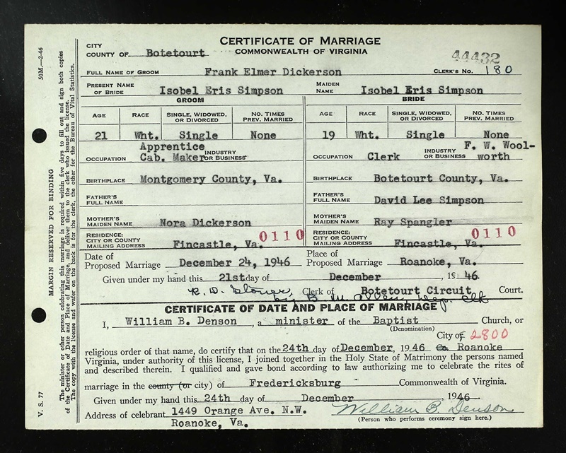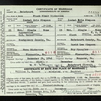 - Image 3 - Certificate of Marriage for Frank Elmer Dickerson and Isobel Eris Simpson, dated December 24, 1946.