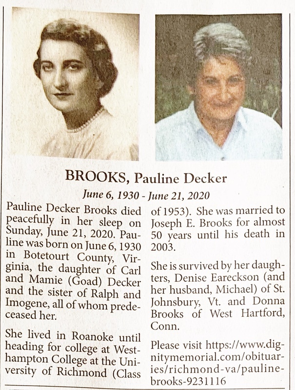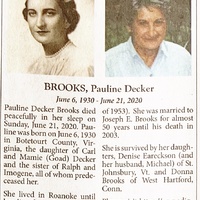 - Pauline Decker Brooks was born June 6, 1930 in Botetourt County to Carl Decker and Mamie Goad Decker. She married Joseph E. Brooks. She had two daughters, Denise Eareckson and Donna Brooks. She died June 21, 2020.