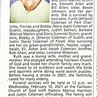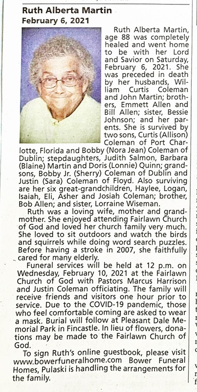 - Ruth Alberta Martin was born August 23, 1932 to Oliver Gilbert Allen and Gay B. Morgan Allen. She married William Curtis Coleman in 1951. After his death in 1960, she married John Dennis Martin in 1971. Her children include Curtis Coleman and Bobby Coleman, and stepdaughters Judith Salmon, Barbara Martin, and Doris Quinn. Ruth Martin died February 6, 2021, and is buried in Pleasant Dale Memorial Park in Fincastle.