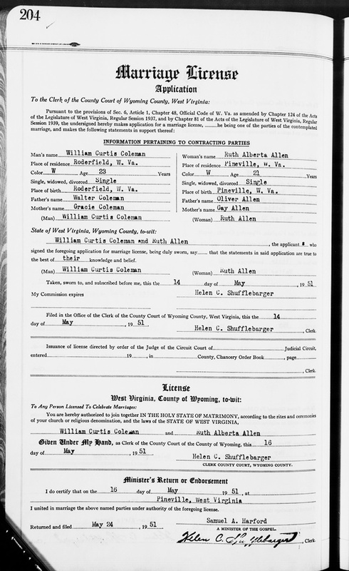 - Image 2 - Marriage License between William Curtis Coleman and Ruth Alberta Allen dated May 15, 1951.
